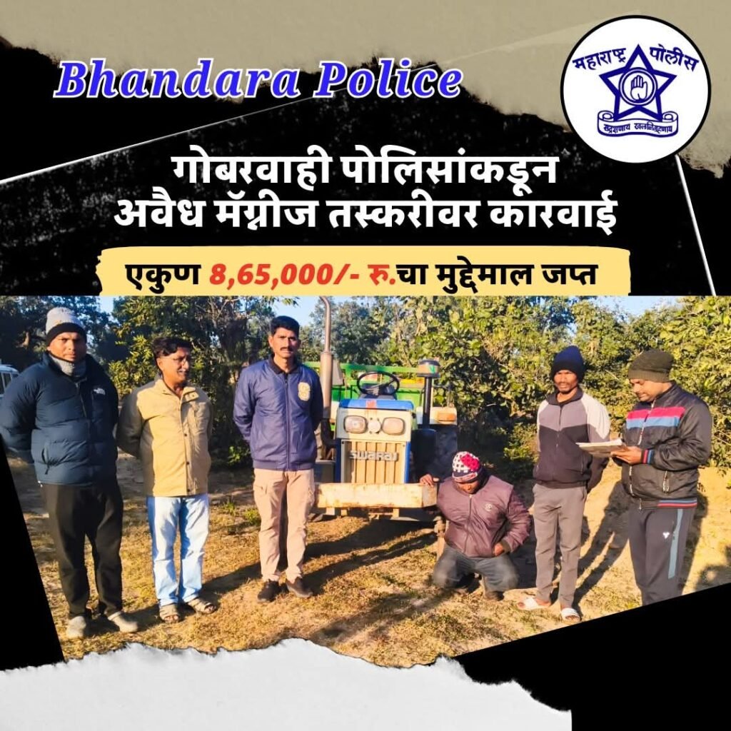 गोबरवाहीं :- पोलीस स्टेशन गोबरवाही अंतर्गत आरोपी नामे दिनदयाल भोवनदास चाचेरे वय 34 वर्षे रा. पवनारखारी, यातील फिर्यादी पो.शि. गायधने हे पोलीस स्टपसह पो.स्टे परिसरात पेट्रोलींग करीत असतांना भौजा डोंगरी बु ते पवनारखारी रोडचे बाजुला एक निळ्या रंगाचा स्वराज कंपणी माडेल क्र. 843 एक्स एम ट्रक्टर क्र. एमएच 35 एजि 0591 व हिरव्या रंगाची विना क्रमांकाची ट्राली चालकाने संशयीत रित्या रोडचे बाजुला घेवुन गेल्याने आम्ही सदर गाडीचे जवळ जावुन पंचासमक्ष सदर गाडीची पाहणी केली असता ट्रॅक्टरचे मागील एक हिरव्या रंगाची विना क्रमांकाची ट्रालीमध्ये वेगवेगळ्या रंगाच्या अंदाजे 80 प्लास्टीक चंगळ्या मध्ये काळा दगळ (मॅग्नीज) अंदाजे 4,500 किलो काळा दगळ (मग्नीज) भरलेला दिसुन आल्याने आरोपीस सदर मालाबाबत विचारपुस केली असता त्यांनी आम्हला सांगीतले की, गाडीत काळा दगळ (मॅग्रीज) असुन सदर मालाचा परवाना नाही सदर माल डोंगरी बु माईल प्रतिबंधीत क्षेत्रातुन चोरी करून आणला आहे असे सांगीतल्याने आरोपीच्या ताब्यातुन एक निळ्या रंगाचा स्वराज क्र. 843 एक्स एम ट्रक्टर क्र. एमएच 35 एजि. 0591 व हिरव्या रंगाची विना क्रमांकाची ट्राली अंदाजे किमती 7,30,000/- रु. व एक हिरव्या रंगाची विना क्रमांकाची ट्रालीमध्ये वेगवेगळ्या रंगाच्या अंदाजे 80 प्लास्टीक चुंगळ्यामध्ये काळा दगळ (मैग्नीज) अंदाजे 4.500 किलो काळा दगळ (मग्नीज) एकुण कि. 1,35,000/- रु. एकुण कि 8,65,000/- रु.चा माल विनापरवाना अवैद्यरित्या मॅगनीज वाहतुक करतांना मिळुन आल्याने नमुद आरोपी विरूध्द फिर्यादीचे लेखी तक्रार व ठाणेदार सा. यांचे लेखी आदेशाने अप क्र. 473/2025 कलम-303 (2), मा. न्या. संहिता-2023 सदर गुन्हा नोंद.