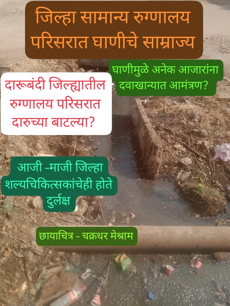 गडचिरोली जिल्हा सामान्य रुग्णालय परिसरात घाणीचे साम्राज्य पसरले असून, या परिसरातील नाल्यामध्ये कचरा असल्याने दुर्गंधी युक्त घाण पहावयास मिळत आहे. त्यामुळे नागरिकांचे आरोग्य धोक्यात आले आहे. इतकेच नव्हे तर जिल्हा सामान्य रुग्णालय प्रशासनाच्या दुर्लक्षित कारभारामुळे स्वच्छ भारत अभियान कार्यक्रमाचे तीनतेरा वाजले आहेत. अनेक डॉक्टर रुग्णांना दारू पिऊन नका असे आवर्जून सांगतात. गडचिरोली जिल्ह्यात दारुबंदी असुनही चोवीस तास आरोग्य सेवा उपलब्ध असलेल्या जिल्हा सामान्य रुग्णालय परिसरात देशी विदेशी दारूच्या बाटलाही पहावयास मिळतात. हि शोकांतिका , लाजीरवाणी बाब म्हणावी लागेल. गडचिरोली जिल्ह्यात विविध प्रकारचे विकास योजना राबविल्या जात असल्याचा दिंडोरी पिटला जात असला तरी तेवढ्याच प्रमाणात अस्वच्छता असल्याने नागरिकांचे आरोग्य विषयक प्रश्न ऐरणीवर आले आहेत. जिल्हा सामान्य रुग्णालय परिसरात असलेल्या घाणीमुळे कॉलरा, टायफॉइड, अतिसार, मलेरिया आणि डेंग्यू यांसारखे गंभीर आजार पसरण्याची शक्यता नाकारता येत नाही . हे आजार दूषित पाणी, अन्न आणि अस्वच्छतेमुळे होतात हे आरोग्य प्रशासनाच्या लक्षात येत नाही का❓